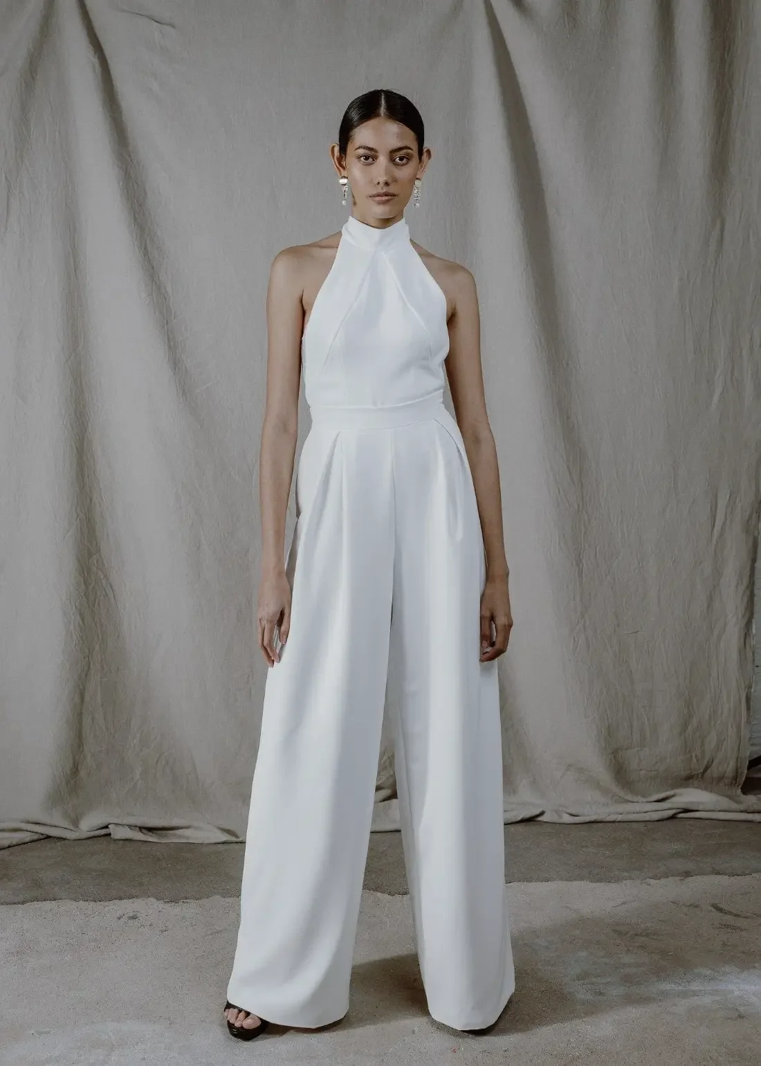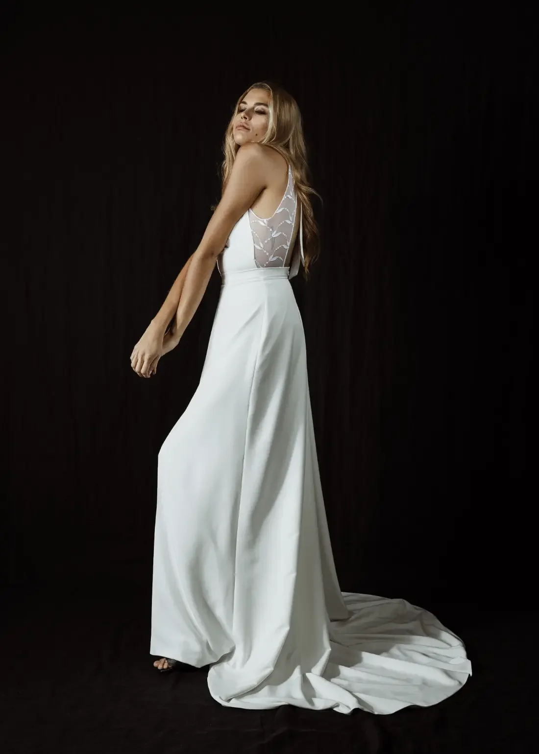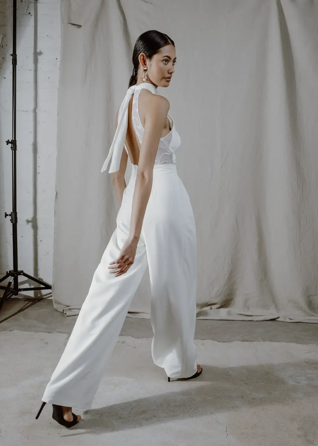 Sintra-hääpuvun voi tilata joko hame- tai housualaosalla. Hameen halkion voi sijoittaa joko keskelle eteen tai sivulle tai jättää kokonaan pois. Valmistetaan tilauksesta ateljeessamme Helsingissä. Materiaaleina kierrätetty polyesteri sekä uusiokäytetty vintage-pitsi.
